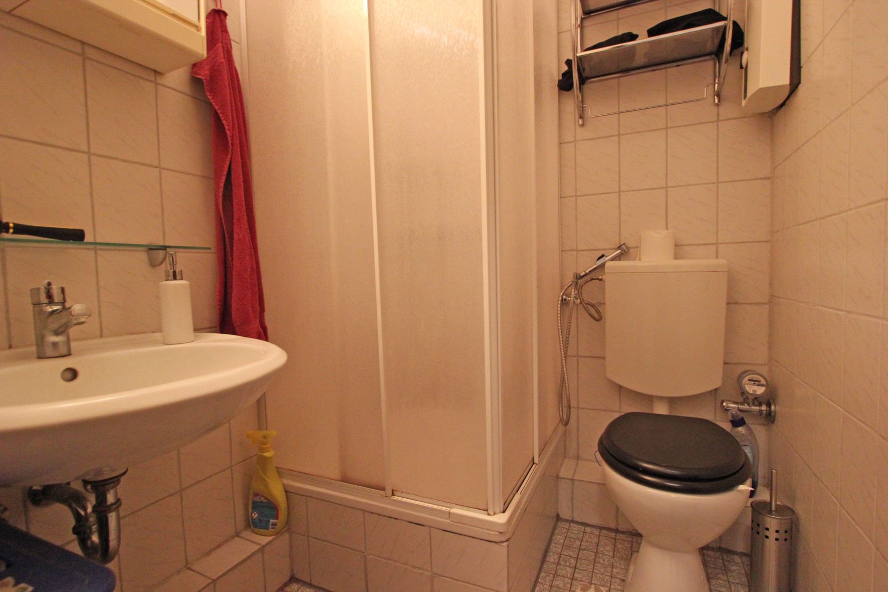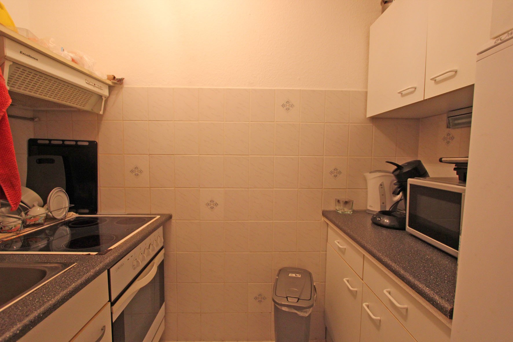 Bei der Küche handelt es sich um eine innen liegende Einbauküche. Das Bad ist ein hell gefliestes Duschbad. Küche und Bad wurden vor einigen Jahren zuletzt modernisiert, es handelt sich also nicht um moderne Küchen- und Sanitärobjekte. Als Bodenbelag wurde im Wohnraum Teppichboden verlegt.